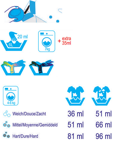 Concentrated. Suitable for washing all types of coloured fabrics, except for wool and silk. Suitable for all types of washing machines and hand washing at temperature from 20 °C to 95 °C.