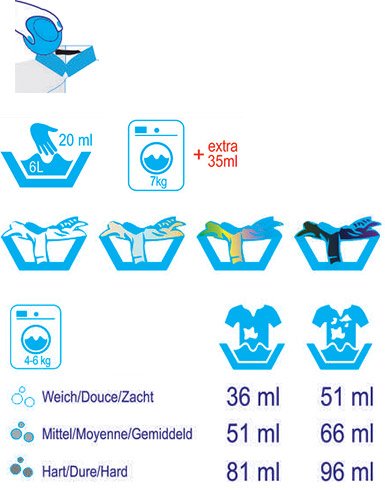 Concentrated. Suitable for washing all types of coloured and light-coloured fabrics, except for wool and silk. Suitable for all types of washing machines and hand washing at temperature from 20 °C to 95 °C.